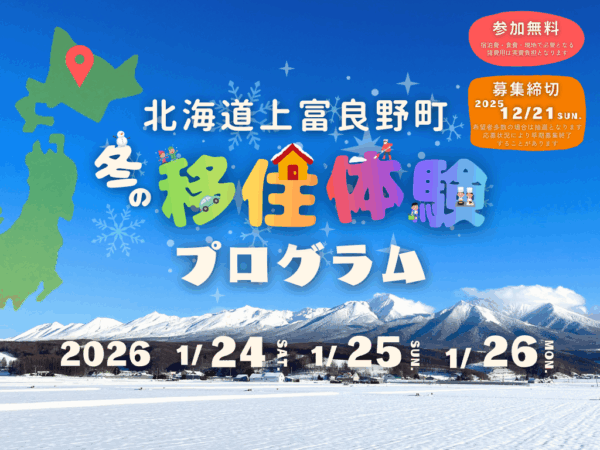 最高気温も氷点下となり、辺り一面が白銀世界となる冬の上富良野町。 このたび、北海道上富良野町での冬の生活を体験する『冬の移住体験プログラム』を開催いたします。 プログラムの詳細情報については、下記のとおりです。 ◆イベン … 続きを読む 【ご案内】冬の移住体験プログラムを開催します!